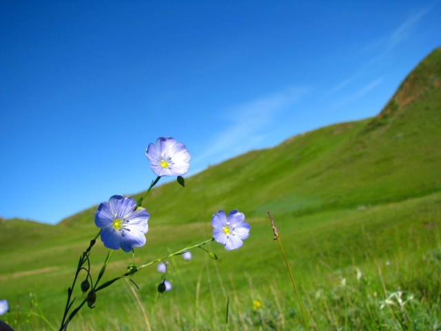 The grass, like an emerald carpet over the land, glistens so bright it hurts my eyes, with a sprinkling of yellow, blue and purple wildflowers everywhere.  Patches of red scorio on the hills stand out like a bright star in the night sky.