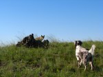 Ahh the adventures I’ve had while walking in my hills with the dogs. One day two coyotes went after Doti who was 50 yards away. I sent Happy to her rescue and he chased the two over a ridge with Doti hot on their trail. I whistled and ran to the top of the ridge where I could see the coyotes going after Happy’s rear every time he turned to come back. I yelled and they moved off a bit allowing the dogs to get back to me. Digging out my camera from my pack, I walked on up the ridge. The two yotes followed close and the male snuck in to 30 feet, then went after Doti when she wondered from my side. He chased her to ten feet from me while I was snapping pictures.