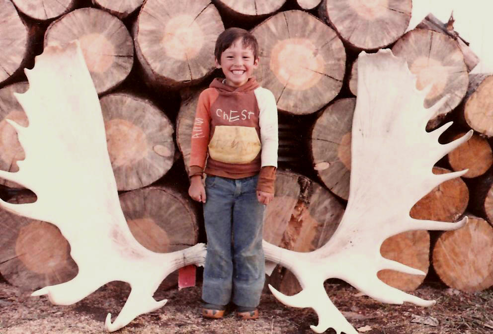Stephen around 5, The sweatshirt has seen better days by now, but moose horns are the same and have traveled many miles with us to Colorado then Montana